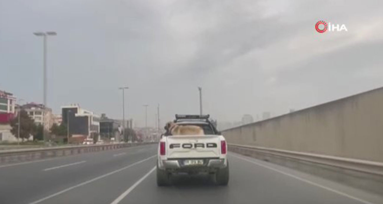 Köpeğini aracın kasasına bağlayarak seyreden sürücü kameraya yansıdı