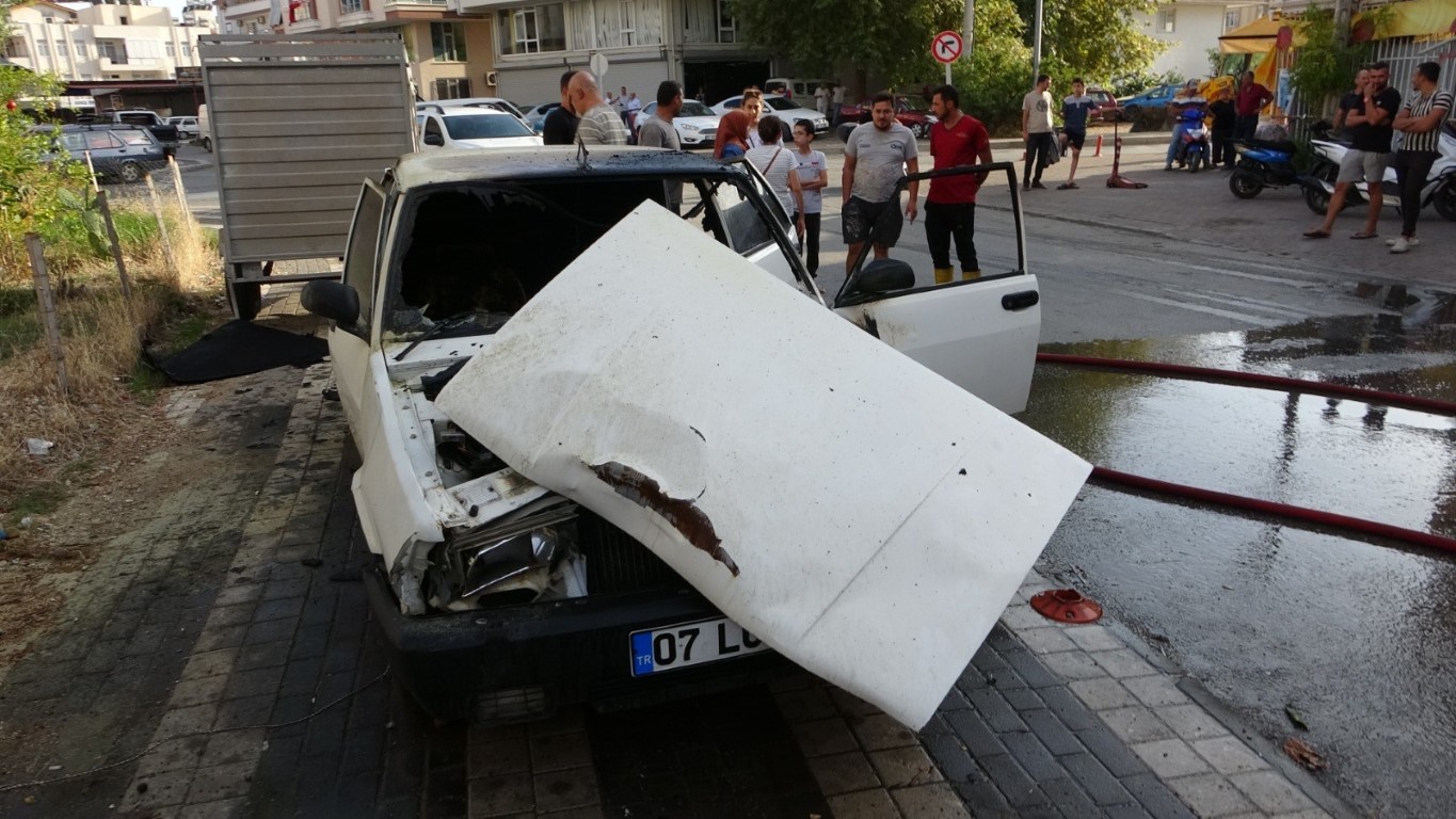 Alev alev yanan otomobilini çeşme hortumuyla söndürmeye çalıştı